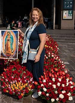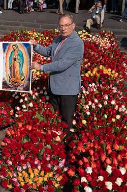 Once all 121 ANF arrangements (including 2 SANOL arrangements) are ready, Dona Ara’s team of family and friends carries them and stages them in front of the shrine within sight of Our Lady’s image. As the thousands of multi-coloured roses arrived, pilgrims from all over Mexico and the world gathered around to admire them. Many pilgrims came to ask who was presenting such a tribute to the Virgin. ANF supporter Felipe Barandiaran, overheard several children asking their mother, “What is all this? What is going on?” Without missing a beat, the mother replied, “They are roses, roses for the Virgin to console her because roses symbolize life. Now, hurry up, we have to go.” It was as if the mother did not even have to think about it, she just knew what we were doing and understood its importance. One lady was so moved by what we were doing that she came up and kissed us on both cheeks!