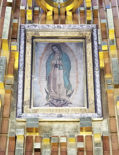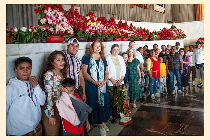After taking photos to record the tribute, Dona Ara’s little army of florists then carried each of the approximately 35-40 pound rose arrangements the last one hundred yards into the Basilica. The men in her family carried an arrangement on each shoulder, carefully placed there by the ladies. Until the boys get stronger, they carried just one arrangement at a time. Back and forth, the men bore the roses with great efficiency, never complaining nor showing any discomfort, happy to be the bearers of ANF’s tribute to the Virgin. With the help of the shrine personnel, they arranged the roses along the tall walls on each side of the miraculous tilma. Then the whole team gathered under one of the walls for a group photo. Like little children who have given their mother something special, joy and a sense of accomplishment radiated from their faces.