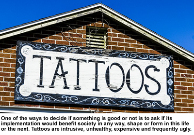 “Again, our Eternally Good God gave us reason so we can decide what is right and what is wrong. So what could be the reason for us to tattoo our bodies other than pressure from others or pressure to conform to the culture? Is pressure alone a good reason for us to do things?”