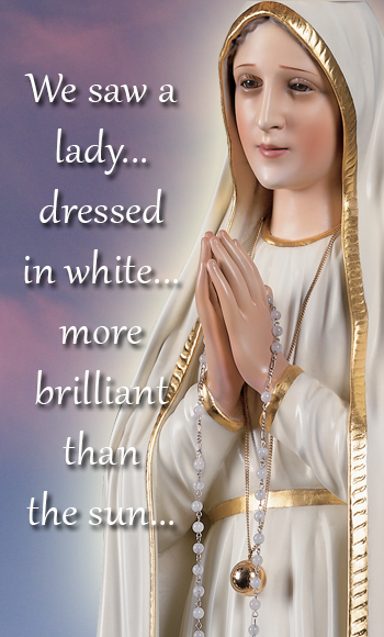 “A lady dressed in white, more brilliant than the sun, radiating a light that was clearer and more intense than a crystal cup filled with water and struck through by the fiery rays of the sun. Her face – indescribably beautiful – was neither sad nor happy, but serious, with an air of gentle reproach. Her hands were joined as if in prayer and were resting at her breast and pointing upward. A rosary hung from her right hand. Her clothes seemed to be woven of light. The tunic was white; her veil was white and edged with gold and covered the head of the Virgin and descended to her feet.”
