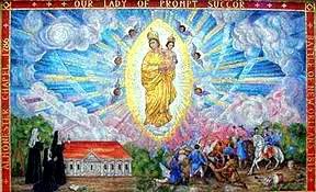 Two signal favours showed Our Lady’s pleasure at the devotion: in 1812 a great fire broke out near the convent, which was doomed for destruction. An old lay sister placed a small statue of Our Lady of Prompt Succour on a window ledge facing the approaching flames; at the same time Mother St. Michel fell on her knees and prayed: “Our Lady of Prompt Succour, we are lost if you do not come to our aid.” The wind veered, the fire died down and the convent was saved.