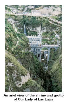 In the year 1754, Maria Mueses de Quiñones, an Indian woman from Colombia, was going from her hometown of Potosi to the village of Ipiales when she was caught in a great storm. At a place called Las Lajas (the Rock Slabs), she sought refuge in a grotto. However, she was anxious since there was a popular legend that said the devil lived in the grotto. With trepidation, she entered the darkness of the grotto, invoking the Virgin of the Rosary. Suddenly, she felt someone tapping at her back, as though calling her. Frightened, she fled back into the storm.