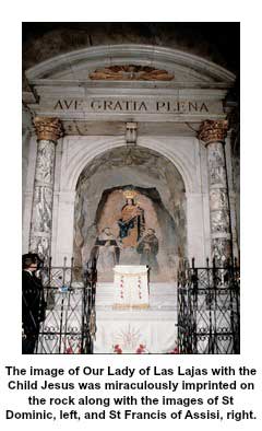 The image of Our Lady of Las Lajas, as that of Our Lady of Guadalupe, has spanned the centuries without losing its brilliance. In the case of Las Lajas, the Divine Painter used a fade-proof method. After German geologists bored core samples from several spots in the image, they determined there was no paint, no dye, or any other pigment on the surface of the rock; the colours are the colours of the rock itself, and they penetrate into the rock evenly for several feet!