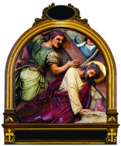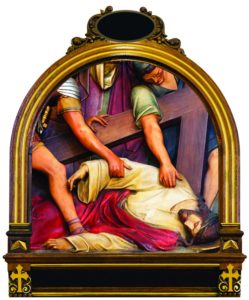 Consider this first fall of Jesus under His Cross. His flesh was torn by the scourges; His head crowned with thorns, and He had lost a great quantity of blood. He was so weakened that He could scarcely walk, and yet He had to carry this great load upon His shoulders. The soldiers struck Him rudely, and thus He fell several times in His journey.