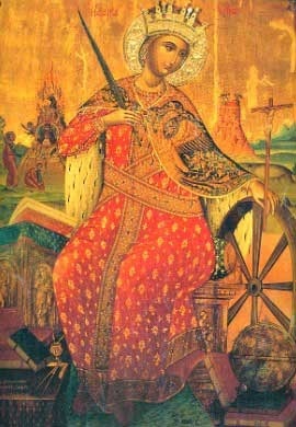 Seeing his best attempts to make the young noblewoman renounce her Faith come to naught, and her words converting many of those who came in contact with her, the Emperor condemned her to die on a spiked wheel. However, when it was brought before her, this instrument of torture was completely destroyed at her touch. Now enraged beyond all control, the tyrant issued orders for her immediate execution. She was summarily beheaded.