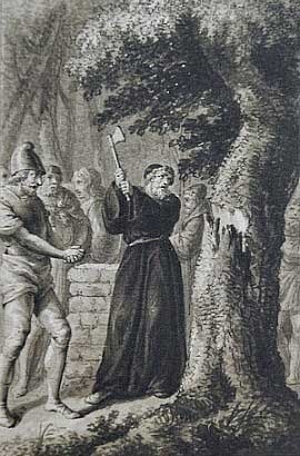 Boniface had enormous work ahead of him. The pagans, though attracted to Christianity, were still bound by fear and superstition to their old religion and gods. To prove to them the falseness of their beliefs and the reality of the one true God, Boniface called the people together and, approaching the “sacred” oak of Geismar, struck it down with an axe, whereupon it split into four parts and fell to the grown in the shape of a cross. Yet, there stood Boniface, still holding his axe, unharmed by their gods.